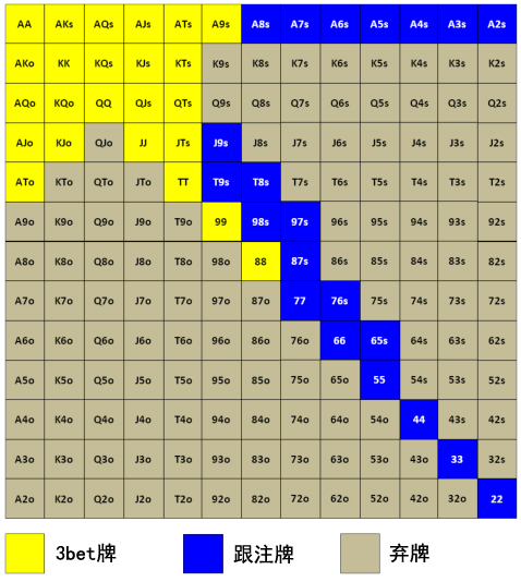 注意,上面所有用黄色标示的牌具有良好的常见牌力,因此Hero可以在许多预计缺乏弃牌赢率的翻牌结构生存下来。有潜力在极少数时候拿到翻牌圈强牌的更弱牌(蓝色)不适合为了价值3bet,更喜欢接受对手率先加注给出的合理价格,试图翻牌圈拿到大牌,然后榨取价值。翻前用33做大底池然后在87%的时候只有一个没有多少弃牌赢率的可怜低对不利于赚取良好的EV。